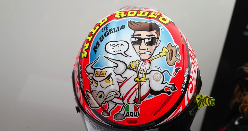 Дизайн шлема Ианноне сделан на тему Запада: надпись «Дикий родео в Муджелло» и ниже — стилизованный Андреа на быке в цветах его Desmosedici из Pramac.