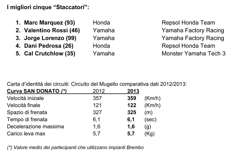 В концу всех сессий были собраны данные телеметрий каждой из команды. По этим данным Brembo составили рейтинг лучших «staccatori» — гонщиков, которые начинают тормозить как можно позже перед поворотом Сан-Донато.