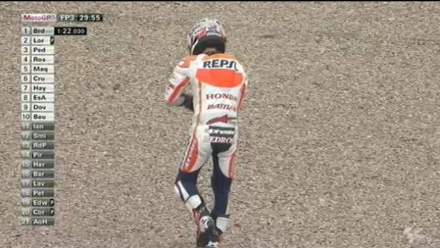 Третья практика Гран-При Германии чемпионата мира MotoGP также не обошлась без падений. На этот раз Дани Педроса неудачно вышел из первого поворота на 15-й минуте сессии, вследствие чего получил жесткий хайсайд. Во время падения Дани сильно ударился левой ключицей. Педроса сразу же был отправлен в медицинский центр. По предварительным данным, испанцу удалось избежать перелома.