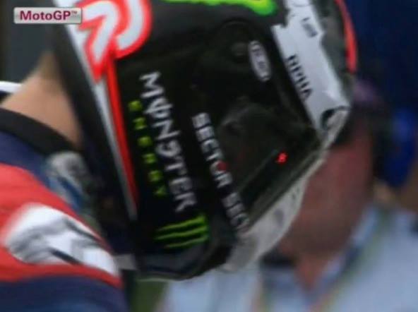 Кажется, что перед стартом гонки чемпионата мира MotoGP в Австралии кто-то с помощью лазера попытался ослепить Хорхе Лоренсо. Фото, взято из телевизионного показа, на котором хорошо видное красное пятно на черном козырьке.