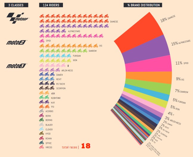 — Dainese является самым популярным производителем экипировки, в экипе итальянской марки гонялось 22 гонщика. Alpinestars идет на втором месте с 18 пилотами, а Spidi — третьем с 14 пилотами
