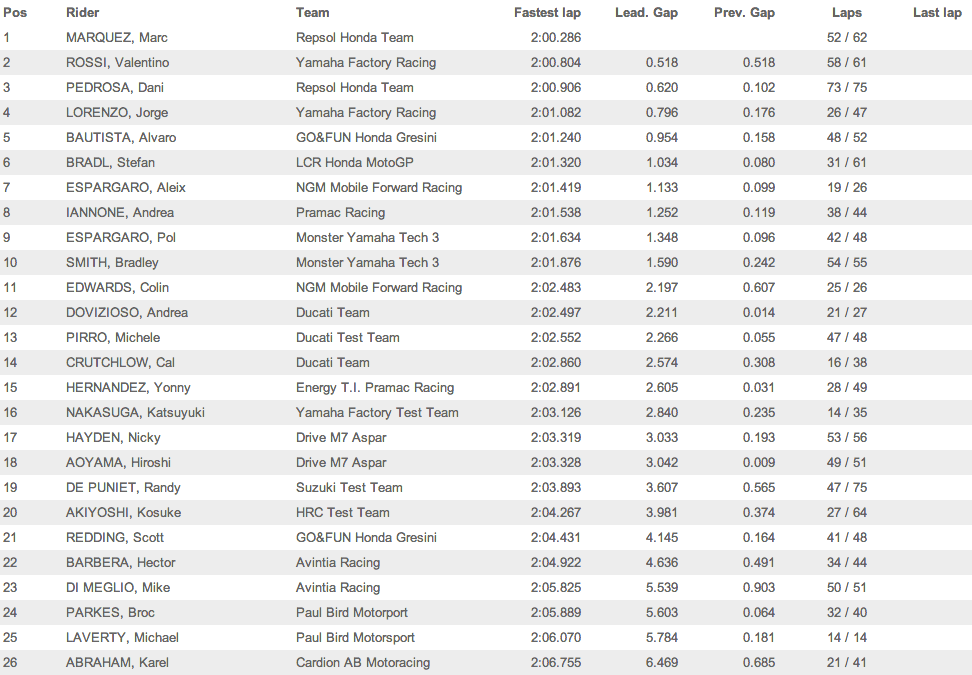 Вчера Марк Маркес опередил ближайшего соперника, Валентино Росси, на более чем полсекунды, а сегодня пилот команды Repsol Honda проехал лучший круг за 1 минуту 59.926 секунд. В то же время Дани Педроса тоже немного прибавил, показав второй результат, но уступив своему товарищу более четырех сотых секунды. Выступая на сателлитном прототипе Honda RC213V, Штефан Брадль показал результаты на уровне с Дани Педросой, обойдя обоих заводских пилотов Yamaha. Кажется, в этом сезоне Honda будет сильна, как и в прошлом, а может доминирование японской фабрики будет еще больше.
