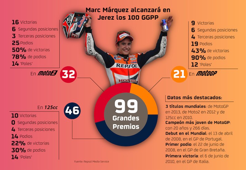 В Хересе Маркес проведет 100-ый Гран-При в своей карьере. По этому случаю один из спонсоров Honda выпустил инфографику, которая подчеркивает некоторые статистические данные о короткой, но очень интенсивной карьере молодого испанца.