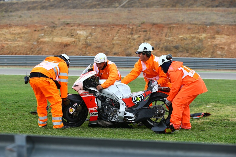 В Арагоне Андреа Ианноне не повезло в самом начале — он выбыл из гонки задолго до того, как сильный дождь переписал весь ход заезда. Ианноне увлекся борьбой с Марком Маркесом и уже на 2-м круге ошибся, выехав на скользкую искусственную траву. С трудом вернув байк под контроль, он в следующее мгновение был вынужден «покинуть корабль», так как на таком мокром покрытии мотоцикл стал просто неуправляем.