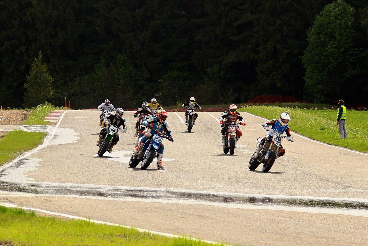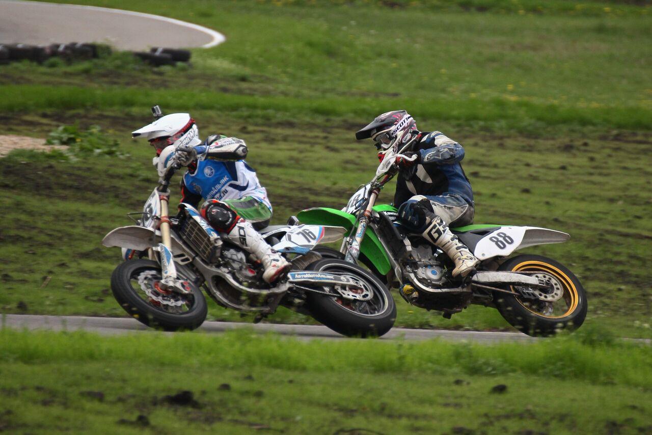 Два дня до начала соревнований лил сильный дождь без перерыва, и мы гоняли на дождевой резине по полностью мокрой трассе с лужами. В день гонки дождь прекратился, и часть трека успела просохнуть. Поэтому в классе Супермото передняя покрышка на моем мотоцикле стояла дождевая, а задняя – слик. Это позволило чувствовать себя достаточно уверенно на мокрых участках трассы, и в то же время на сухих участках передняя покрышка не перегревалась и давала хороший зацеп. В день гонки, одевать дождевую резину было нежелательно, т.к. по своему составу она мягкая, а это привело бы к ее перегреву и быстрому износу. Поэтому в классе МиниМотард для гонки были выбраны слики, что позволяло чувствовать себя уверенно на сухих отрезках трассы, но приходилось сбавлять темп на мокром покрытии.