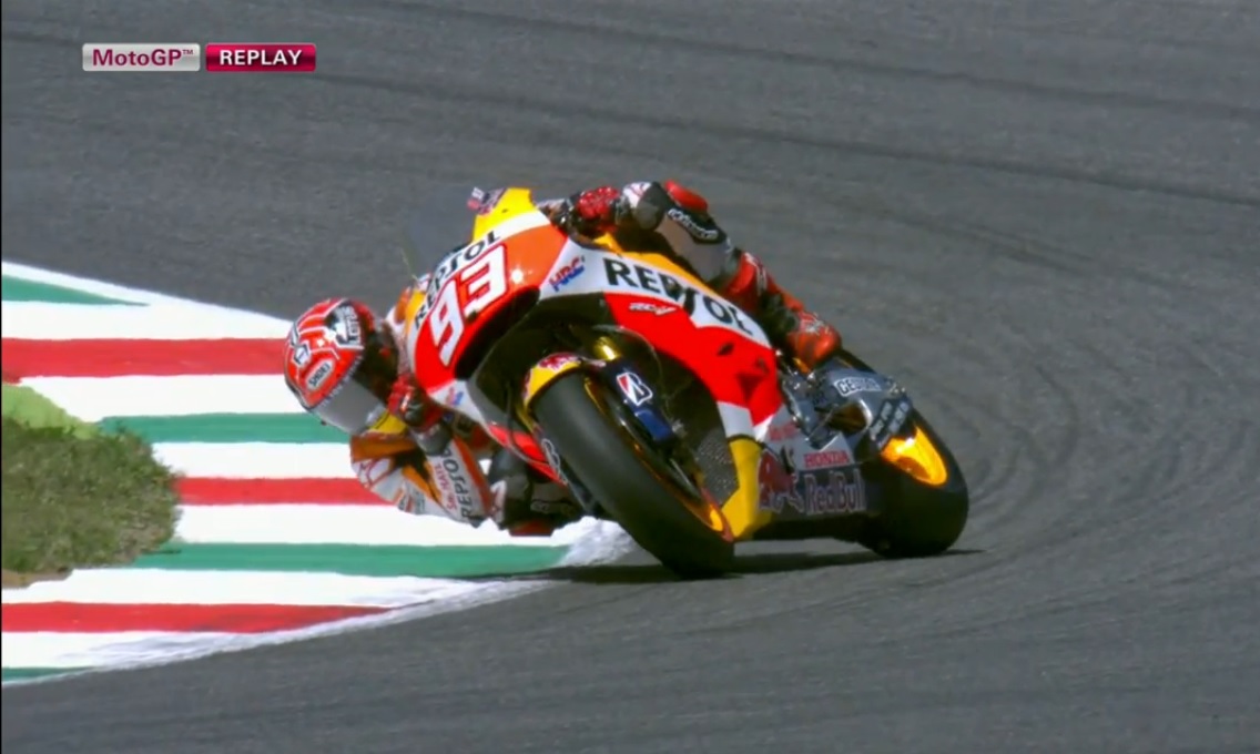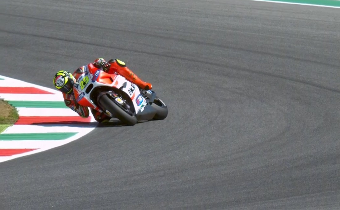 Марк Маркес (Repsol Honda) и Андреа Ианноне (Ducati Team) на пятничных тренировках Гран-При Италии продемонстрировали эффектное прохождение дуги Correntaio — 12-го поворота трека Муджелло. Ducati Андреа огрызнулась в ответ на избыточную тягу и чуть не сбросила своего гонщика, в то время как Honda Марка повела себя спокойнее и позволила чисто пройти поворот.