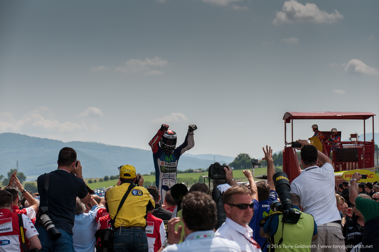 Лоренсо взял хороший старт со второго места и до завершения первого круга пробрался через Андреа Довициозо (Ducati Team) на входе в Arrabiata 1 — после обгона тот так и не вернул себе лидерство. Удерживая стабильный темп во главе пелетона, Лоренсо в итоге победил с отрывом в 5,563 секунды от обладателя поула Андреа Ианноне на Ducati GP15, при этом Валентино Росси сохранил лидирующее положение в зачете чемпионата, финишировав в Италии третьим, всего через секунду после Ианноне. Все три призера гонки выбрали комбинацию из сликов среднего состава «по кругу».