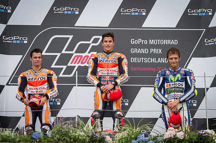 Марк Маркес (Repsol Honda) отметился на Заксенринге доминирующим уик-эндом, выиграв Гран-При Германии и опередив напарника Дани Педросу. Двухкратный чемпион мира продлил свою серию успехов на немецком треке, победив на нем шестой раз подряд.