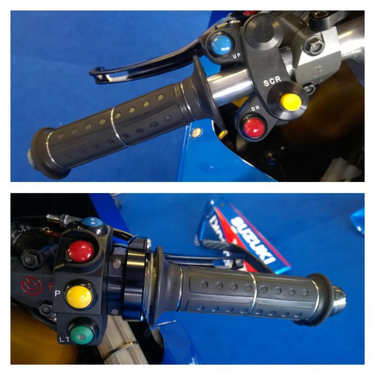 На нижней картинке вы можете увидеть клавиши, на которые гонщик нажимает правой рукой. Нажав зеленую кнопку, пилот включает задний сигнал, если на трассе дождевые погодные условия. Желтая кнопка активирует ограничитель скорости, что очень нужно гонщикам для прохождения пит-лейна (60 км/ч). Красная кнопка отключает двигатель GSX-RR, а голубая активирует старт-контроль, нужный на старте гонки.