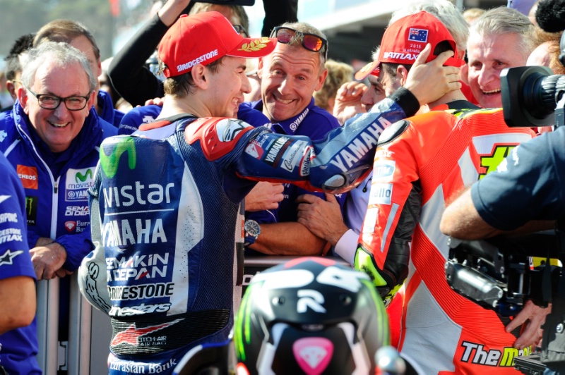 Кажется, у нас уже становится традицией выкладывать после гонки фотографию, на которой один из лидеров чемпионата (Росси или Лоренсо) искренно радуется за гонщика, отобравшего очки у соперника в борьбе за титул. Сначала Хорхе радовался за Педросу, как за своего сына, на следующем Гран-При то же самое проделал Росси. Теперь Педросу заменил Андреа Ианноне.