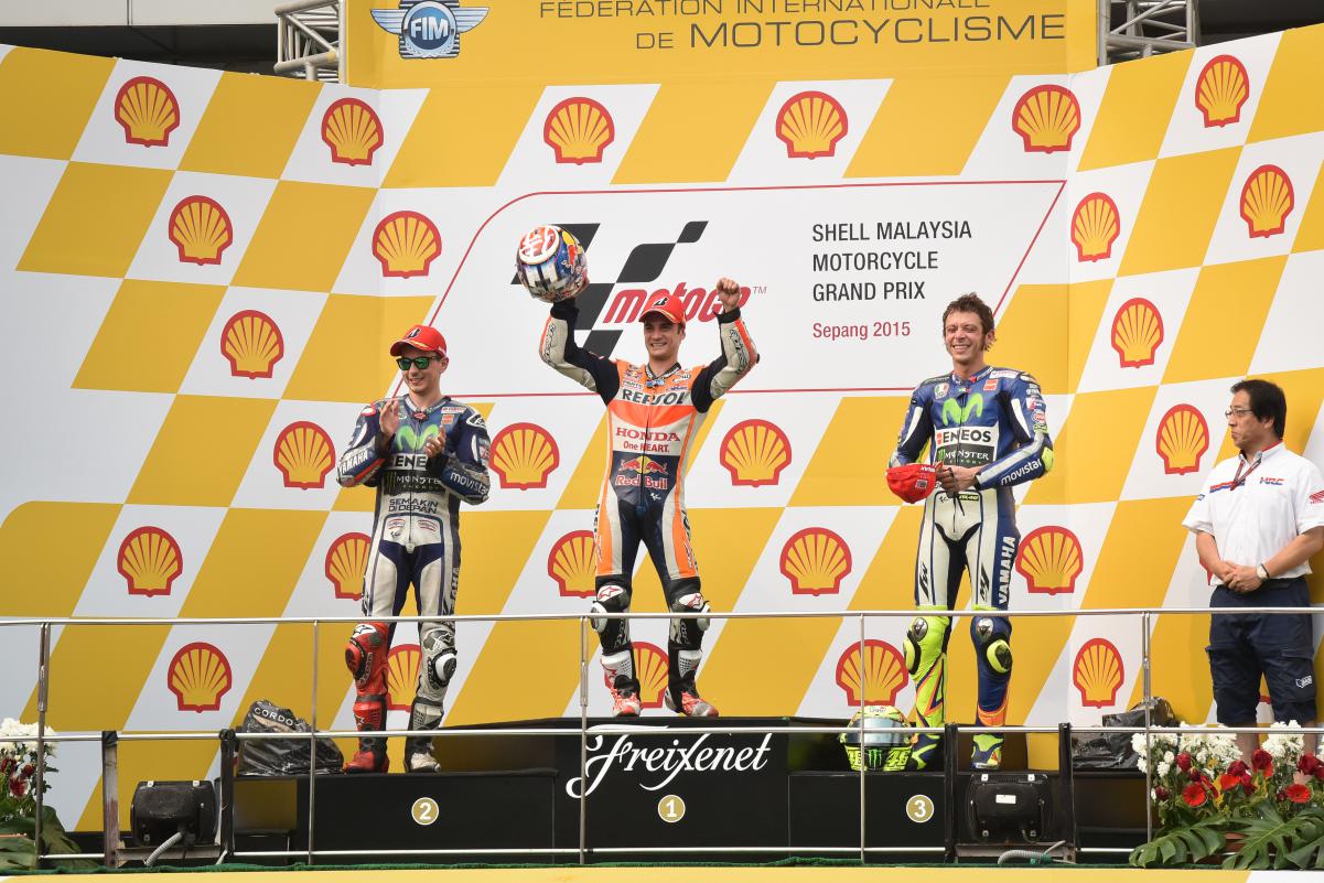 Педроса стартовал с первой позиции и взял холшот при вхождении в первый поворот, после чего пролидировал остаток гонки. Его время всего заезда установило новый рекорд малазийского Гран-При, побив старое достижение более чем на семь секунд. Пилоты Movistar Yamaha Хорхе Лоренсо и Валентино Росси финишировали вторым и третьим соответственно. Этот результат означает, что Лоренсо сократил разрыв до своего напарника всего до семи очков за один этап до конца, на котором определится чемпион MotoGP 2015 года.