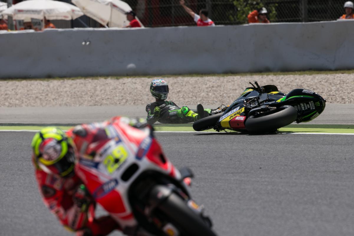 Как и в Италии, в Каталонии не финишировало восемь райдеров, но не все «спеклись» из-за асфальта: Марк Маркес снова стал жертвой норова собственного мотоцикла, Андреа Довициозо дал слишком много газа в сильном наклоне, а Алейш Эспаргаро упал, когда отклонился с идеальной траектории и наскочил на кочку. Его брат Поль тоже уронил байк и испортил себе домашнее выступление.