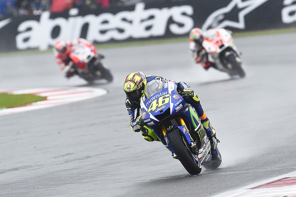Первый раз в 2015 году гонщики MotoGP попали под сильный дождь в Великобритании. Поливать начало буквально в последний момент — утром перед гонкой, чем многие после двух теплых солнечных дней были озадачены. Валентино Росси не упустил шанс продемонстрировать свой уверенный дождевой пилотаж, за что был вознагражден первой мокрой победой за семь лет. Последний раз Вале так же уверенно «ходил» по воде на премьерном штормовом Гран-При Индианаполиса 2008 года, когда ураган Айк грозил смыть с трека гонщиков и зрителей.