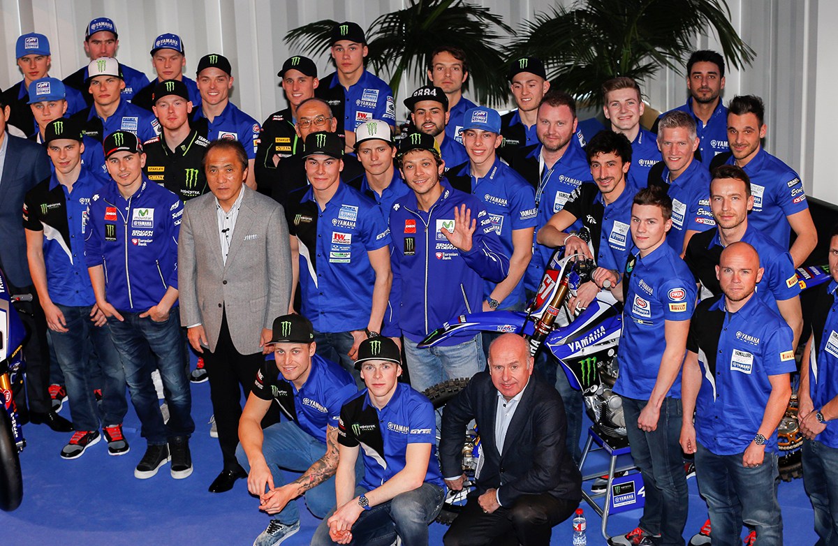 На групповом фото, кроме Хорхе Лоренсо и Валентино Росси, можно заметить также пилотов Yamaha Tech 3 Брэдли Смита и Пола Эспаргаро. Сильвен Гвинтоли и Алекс Лоус будут защищать цвета «Ямахи» в мировом Супербайке, Ромен Февр и Джереми ван Хорбик — в мировом мотокроссе, и так далее. Кстати, в команде синих есть и россиянин — Александр Тонков (за правым плечом Росси), который станет выступать в категории MX2 чемпионата MXGP.