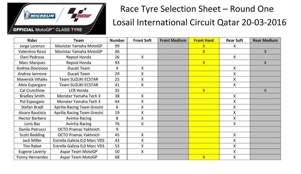 Шинным выбором Лоренсо стал жесткий Michelin Power Slick спереди в паре с мягким Michelin Power Slick сзади. Этот выбор отличался от его напарника Росси, который ехал на жестком переднем и среднем заднем — также, как Маркес, тогда как Довициозо предпочел мягкую переднюю и такую же заднюю шины. Выбор Лоренсо сослужил ему хорошую службу, так как он стабильно ставил быстрейшие круги гонки, пока на 16 круге не побил рекорд круга, который держался с момента установления Кейси Стоунером в 2008-м. Затем тот был улучшен на 20 круге до времени 1:54.927 — на 0,226 секунды лучше стоунеровского, что показало выносливость и стабильность шин «Мишлен». Лоренсо пересек черту со временем гонки 42:28.542 — это более чем на семь секунд быстрее прошлогодней гонки.