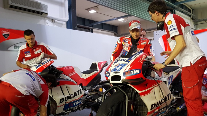 План был в том, чтобы в первый день провести сравнение между GP15 и машиной 2016-го. Мы хотим сделать это завтра, хотим отыскать и проанализировать отличия между двумя мотоциклами. Единственное, что я в понедельник сделал с Desmosedici 2016 — это просто проверочный выезд на один круг — нам хотелось убедиться, что все работает и идет по графику . Сейчас надеюсь, что мы проедем во вторник несколько кругов. Для начала надо поездить по сухому треку… Потом сможем поработать с временами круга.