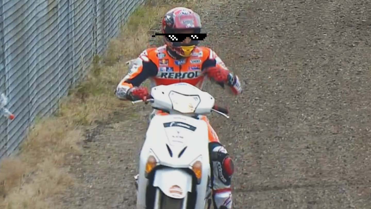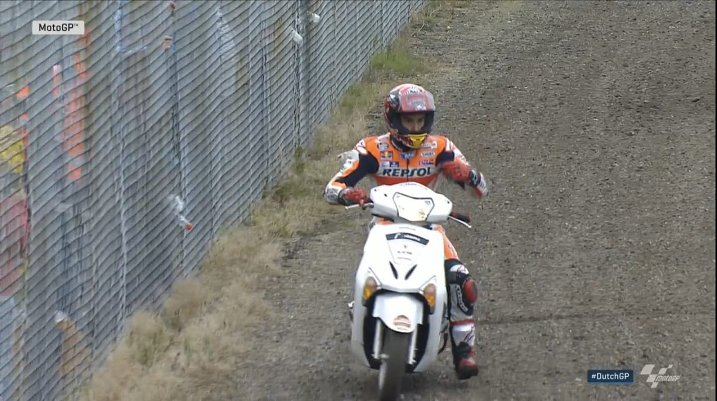 Сегодня во время квалификации MotoGP Гран-При Нидерландов в Ассене Марк Маркес сам допустил ошибку и разбил свой мотоцикл. Испанец опять же не растерялся, одолжил у фотографа скутер и помчался в боксы. В итоге пилот Repsol Honda Team успел проехать два круга на запасном мотоцикле, но чуда не произошло — Марку не удалось взять поул, молодой испанец квалифицировался на четвертой позиции, что, в принципе, также достаточно неплохой результат.