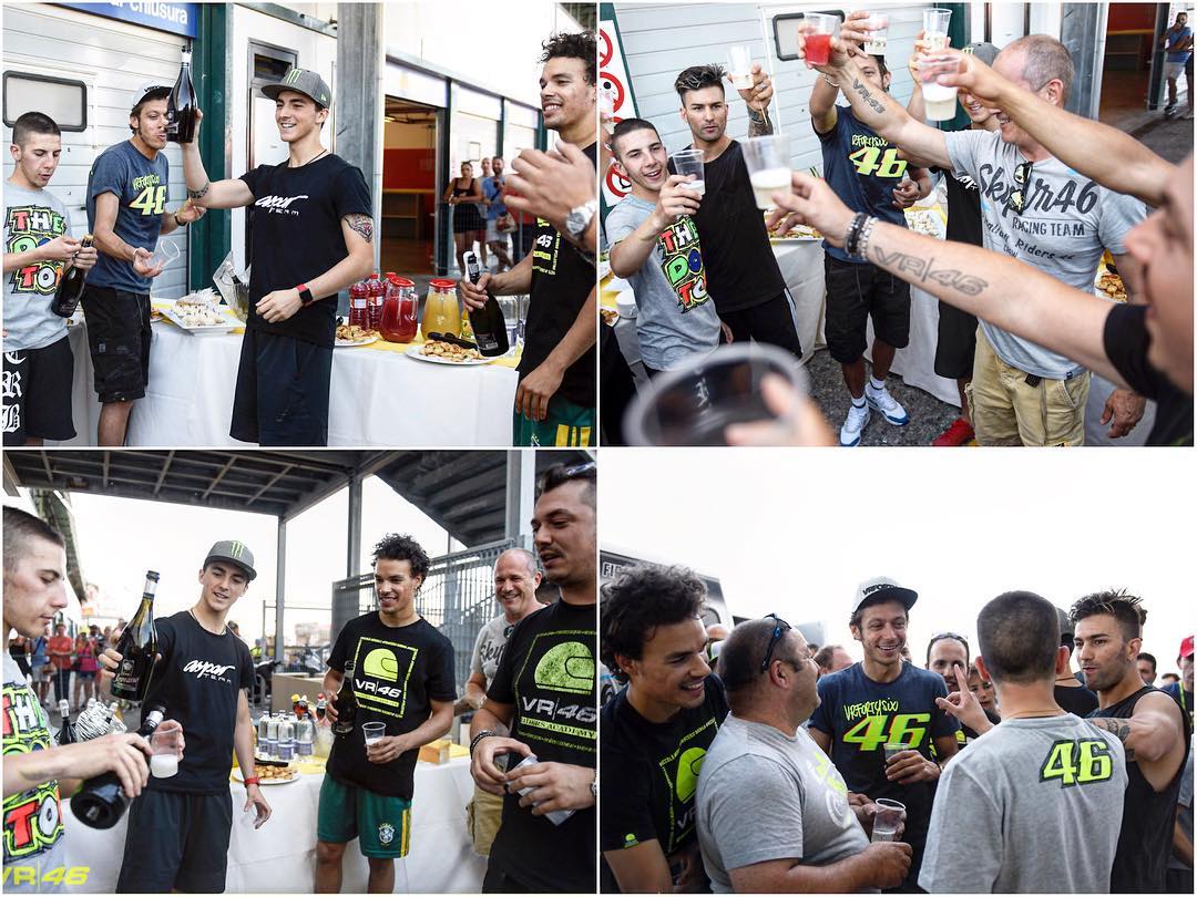 Победа Франческо Баньяйи в гонке Moto3 Гран-При Нидерландов, вырванная итальянцем из рук сразу нескольких претендентов, была слишком хороша для того, чтобы отпраздновать ее только раз. В ассенском Соборе скорости Пекко пережил исторический день, добившись в Гран-При первого триумфа и для марки Mahindra, и для самого себя. Чтобы отметить это дело снова, Валентино Росси со своим окружением после тренировки на треке Мизано организовал для счастливого гонщика Академии VR46 небольшой фуршет, на котором победитель получил новую порцию поздравлений.