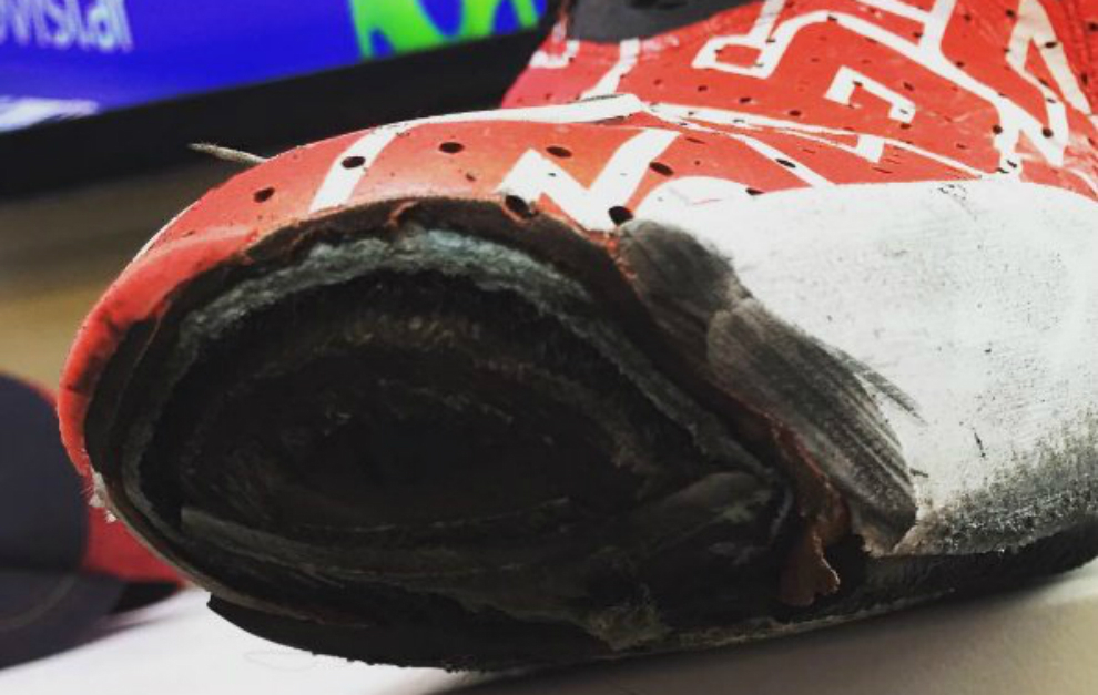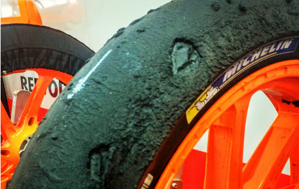 Передняя шина, от которой сильно вибрировал перед мотоцикла, взяла на себя исключительные нагрузки, но не только она — также пострадал и левый мотобот Дани, так как на торможениях он выставлял ногу и часто касался асфальта, лишь бы байк держал траекторию. Шина, сваренная вкрутую, и изрядно подкопченный мотобот — «десерт» от Michelin, которым запомнился этот Гран-При Арагона.