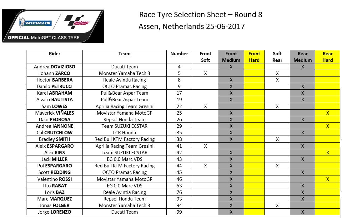 Две недели назад в Каталонии все пилоты MotoGP проигнорировали мягкие шины Michelin, так как средние и жесткие при высокой температуре асфальта и воздуха давали ту же динамику при повышенной износостойкости. Вчера в Ассене тоже была шина, которой устроили бойкот — ею стала жесткая передняя. Хотя легендарный трек сочетает в себе скользкие старые участки и более новые абразивные, нагрузки на шины в сравнении с другими площадками MotoGP разнятся от средних и ниже, поэтому пилотам важнее цепкость и хорошая связь в быстрых поворотах.