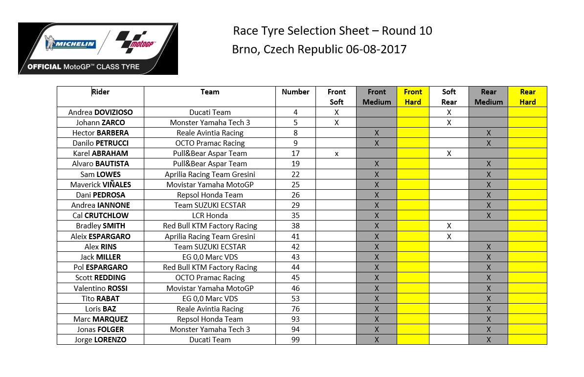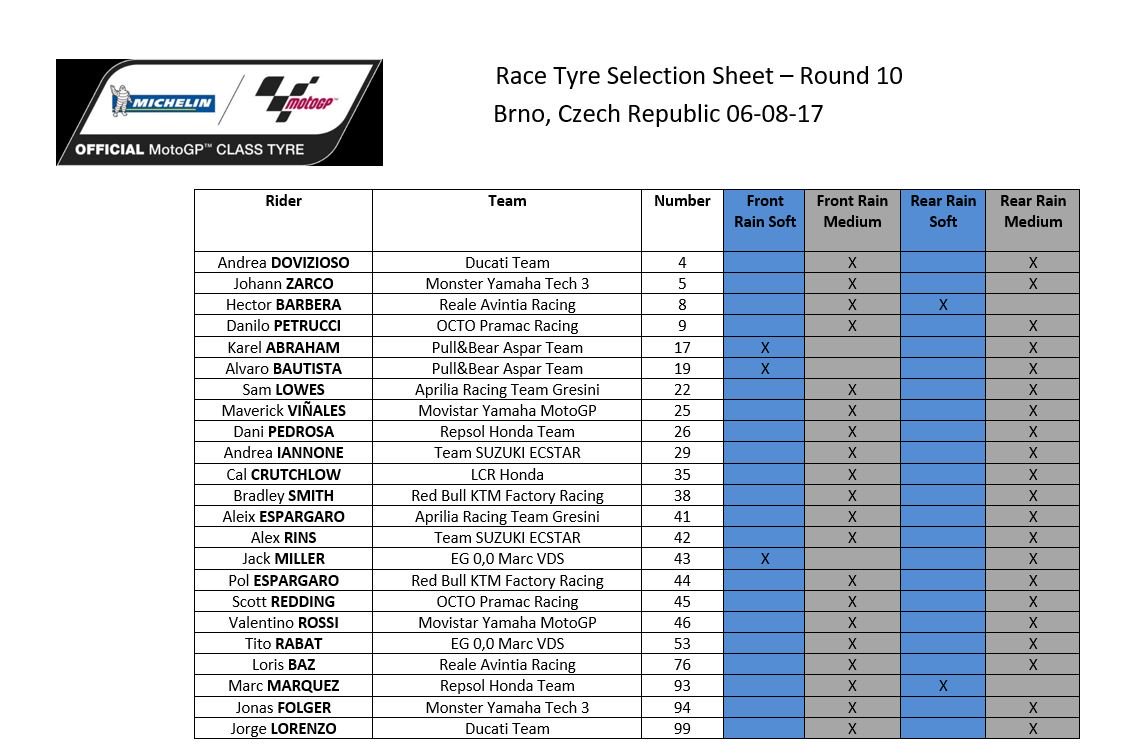 Гонку в Чехии пилоты MotoGP провели на двух наборах шин — дождевом и сухом. Заезд был объявлен дождевым, но было очевидно, что асфальт находится в процессе высыхания, которое ускорилось по ходу гонки солнцем, выглянувшим из-за туч. Нервозность на стартовой решетке явилась причиной замены одних дождевых покрышек на другие.