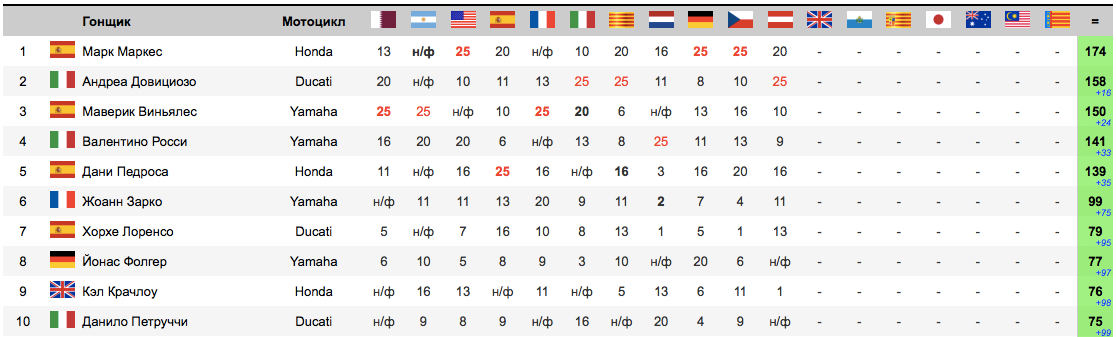 Лоренсо, Маркес, Довициозо, Росси, Виньялес, Педроса, Зарко, Ианноне, Баз, Фольгер