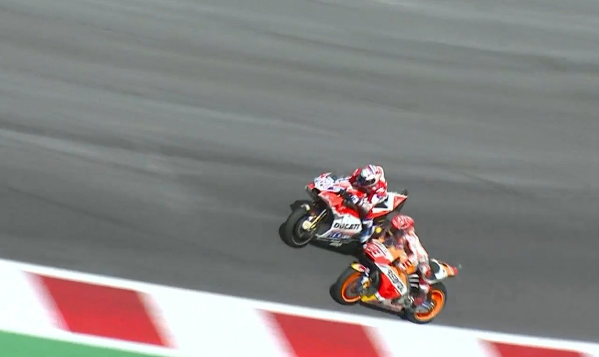 Теперь план испанца сработал, хотя через мгновение оказалось, что он попал в ловушку пилота Ducati. Андреа слышал, как преследователь пораньше открутил газ, и решил подыграть ему, открыв дорогу в поворот. Траектории обоих байков оказались испорчены, так как Маркес далеко уехал на торможении и очутился перед носом у Довициозо, которому со злостью пришлось выруливать в сторону. Мысль Дови оказалась верна — он обеспечил себе лучший выход и финишировал на 0,176 секунды раньше.