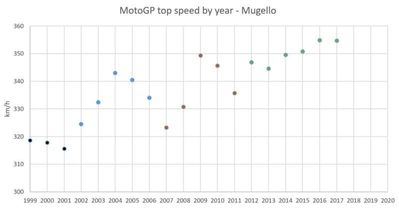 Начиная с 2002 года (наступления эры MotoGP) наблюдается тенденция роста максимальной скорости на 10 км/ч каждые 4-5 лет. Современные прототипе разгоняются на длинной прямой трассы Муджелло примерно на 35 км/ч быстрее, чем когда-то 500-кубовые мотоциклы.
