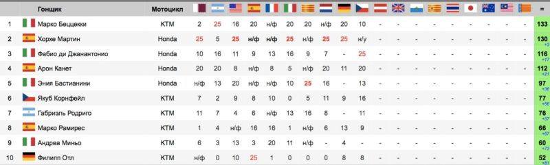 | поз. | очки | гонщик | нац. | команда | байк | время | км/ч | отст. | |