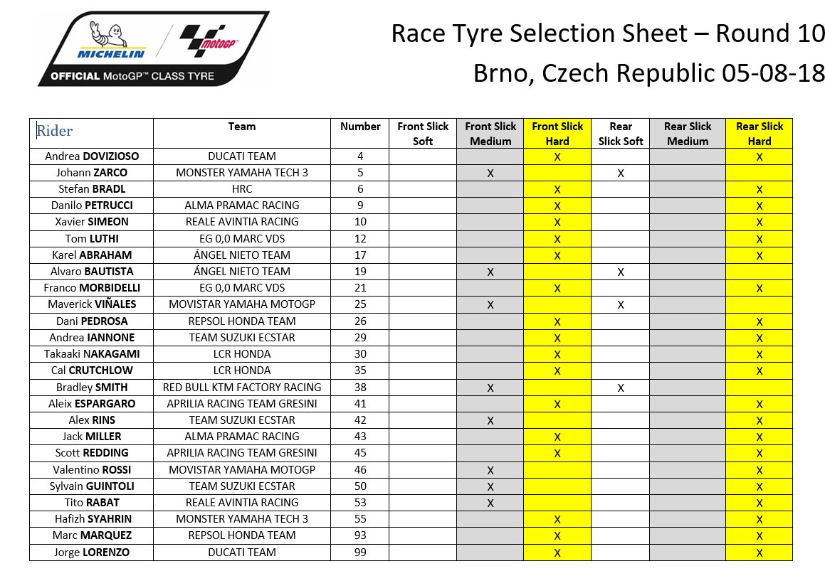 Приехавшие следом Валентино Росси (Movistar Yamaha) и Кэл Крачлоу (LCR Honda Castrol) помучились с задним hard, их мотоциклы буксовали на разгонах. Для Крачлоу положительный момент в том, что передняя шина в Брно вела себя образцово. В прошлые разы британец неоднократно её перегревал. Дани Педроса (Repsol Honda) на восьмом месте, Андреа Ианноне (Suzuki Ecstar) на 10-м, Алейш Эспаргаро (Aprilia Gresini) на 15-м пожаловались на очень слабый держак заднего жесткого варианта.
