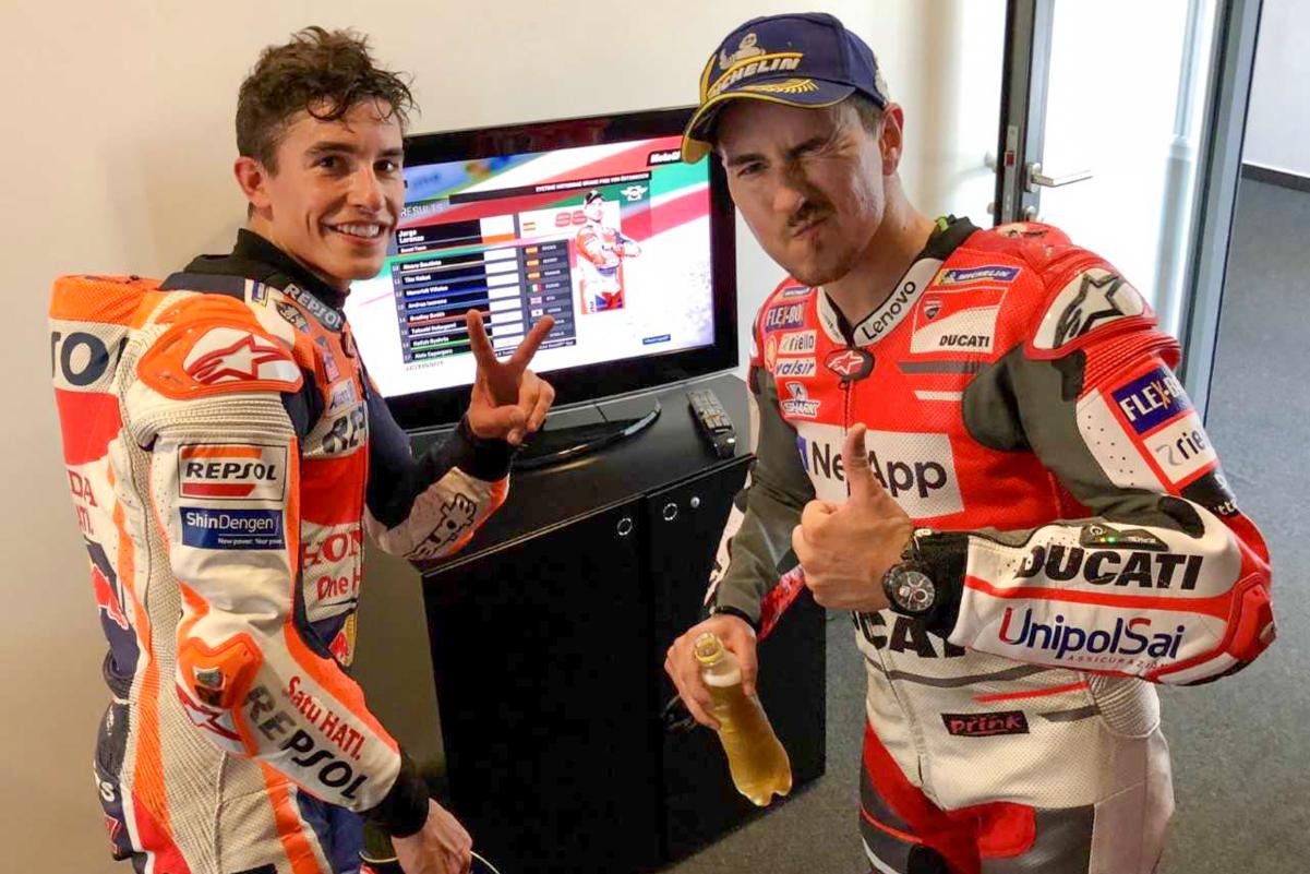 Марк Маркес по итогам Гран-При Австрии стал вторым и увеличил в чемпионате отрыв от Валентино Росси до 59 очков. Хорхе Лоренсо выиграл гонку, и эта победа помогла испанцу вернуться в топ-3 в личном зачете впервые после ухода из Yamaha. Судя по фото, оба испанца довольны результатами гонки и собственным прогрессом в личном зачете.