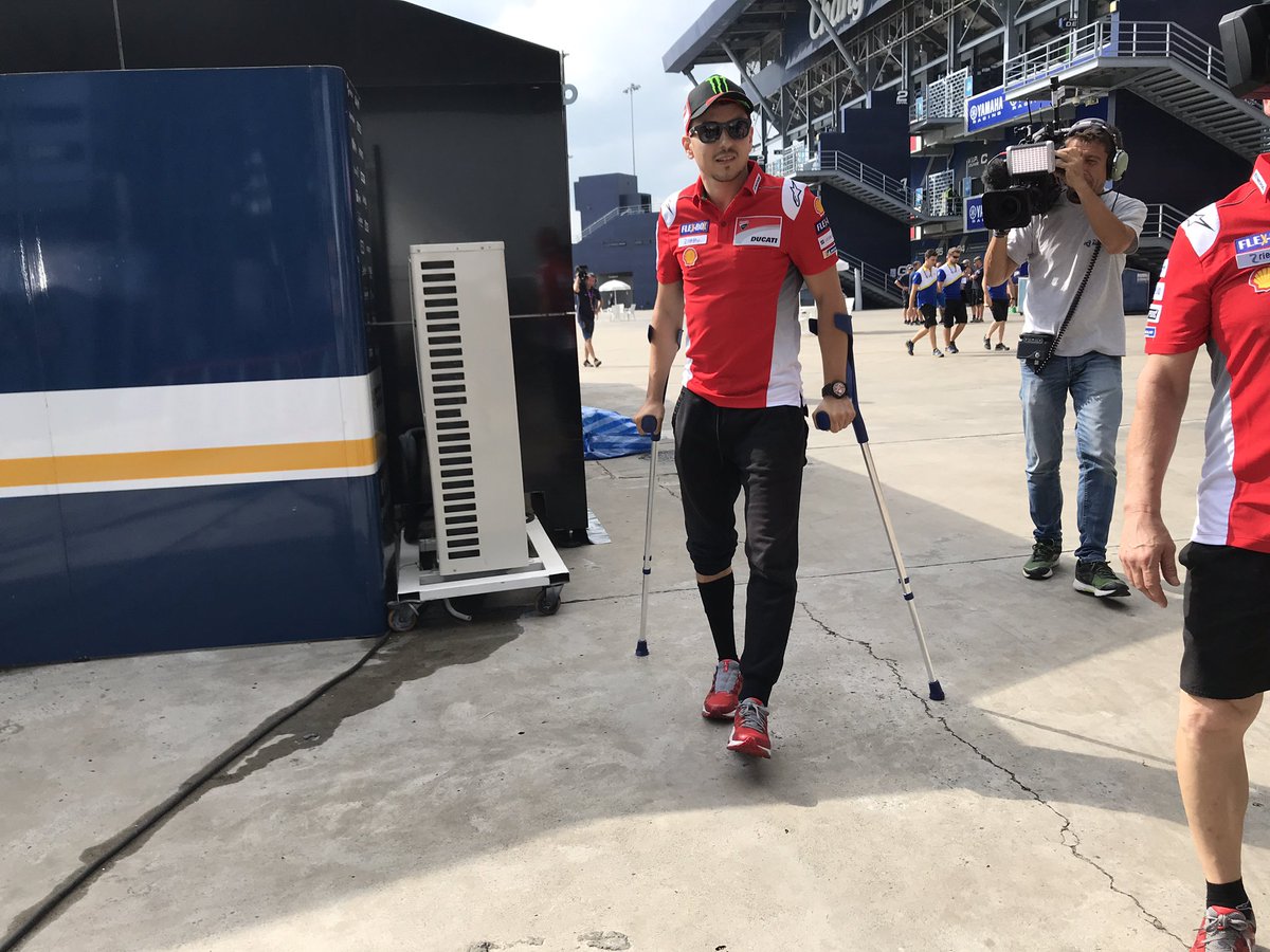 Две недели назад Лоренсо сомневался насчет такой возможности. Он травмировал правую ногу при падении в первом повороте арагонской гонки (вывих большого пальца, сломана вторая плюсневая кость). Лоренсо до сих пор передвигается на костылях. Со ступни не сошел отёк — с надеванием мотобота будут проблемы.