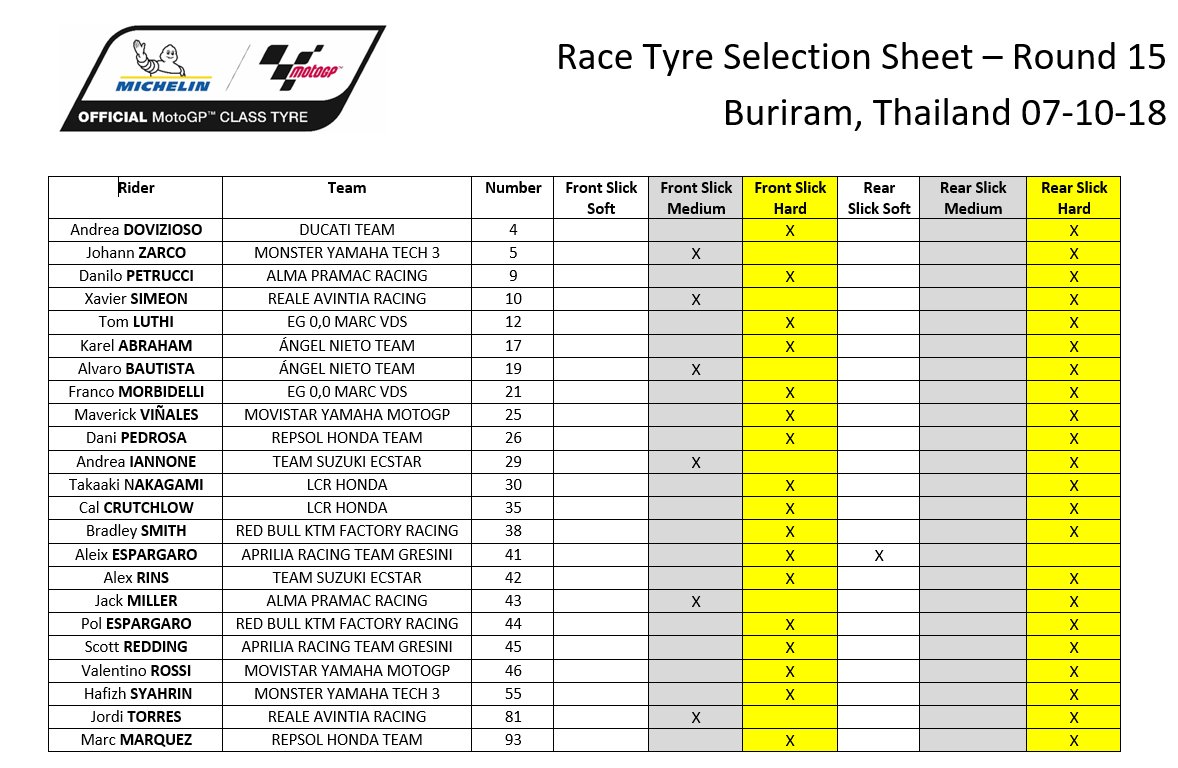 22 пилота из 23-х выбрали задний hard, один Алейш Эспаргаро (Aprilia Gresini) взял soft. Больше разнообразия по передней: 17 в пользу жесткой, 6 в пользу средней. Первые четыре места заняла одинаковая комбинация из двух «хардов». Марк Маркес (Repsol Honda) отлавливал мотоцикл из-за перегрева передней шины, но победил. Андреа Довициозо (Ducati Team) пришел вторым, порадовался уровню зацепа. Бронзовый призер Маверик Виньялес (Movistar Yamaha) и приехавший за ним напарник Валентино Росси высоко оценили тайские «Мишлены» — с ужесточенными шинами М1 почему-то перестали буксовать.