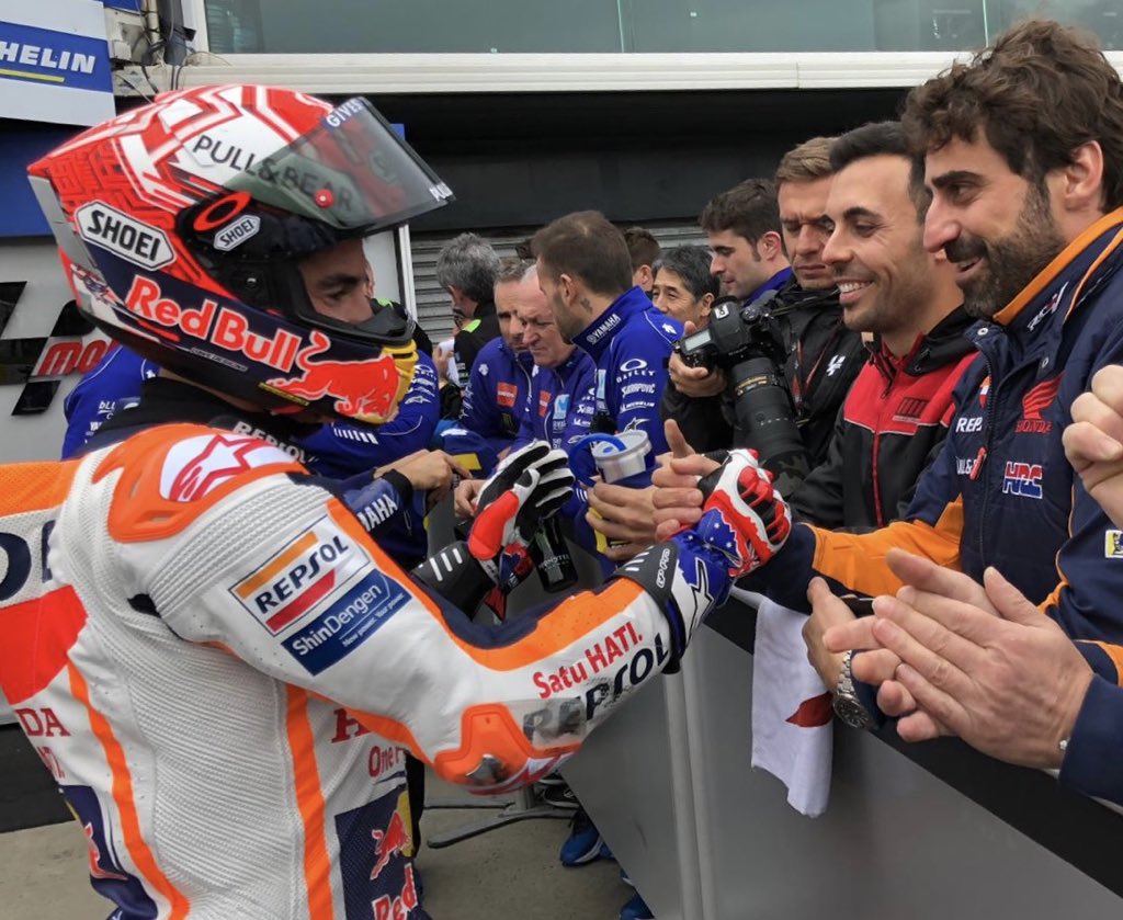 На прошлой неделе в истории Honda появился второй пятикратный чемпион премьер-класса Гран-При. Марк Маркес получил это достижение через 20 лет после того, как Мик Дуэн стал пятикратным в 1998-м. На уик-энде в Австралии Маркес посвятил экипировку своему другу Дуэну — перчатки и мотоботы в такой же красно-сине-белой расцветке. Австралиец был и на ГП Японии, когда испанец выиграл титул.