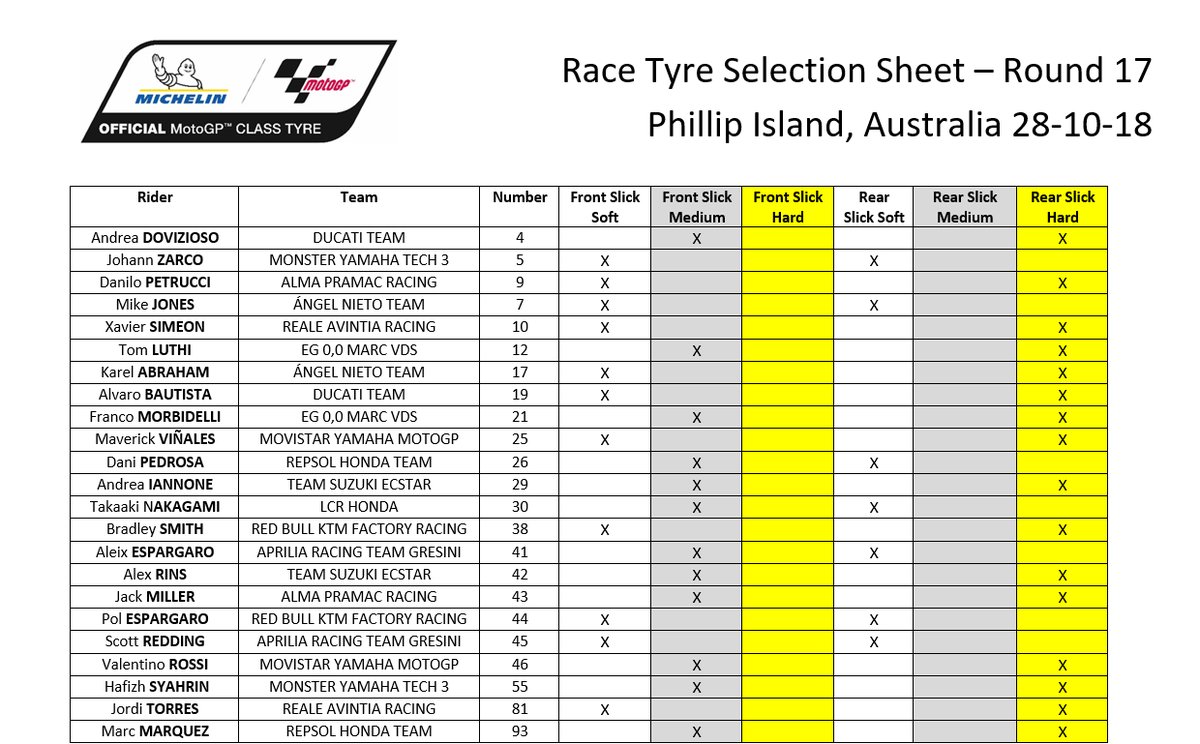 На подиуме не было никого с мягкой задней шиной, потому что Андреа Довициозо (Ducati Team) тоже выбрал hard. В этой гонке итальянца ограничивала не очень высокая поворотная скорость Ducati — шины здесь не играют роли. На таком же мотоцикле четвертым приехал Альваро Баутиста — временная замена Хорхе Лоренсо. Выбор повторял выбор Виньялеса.
