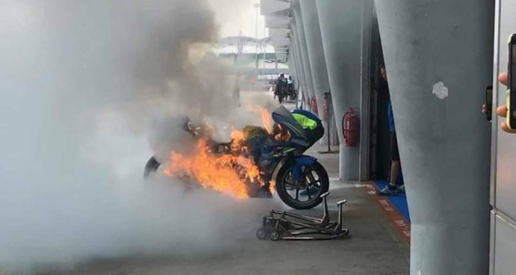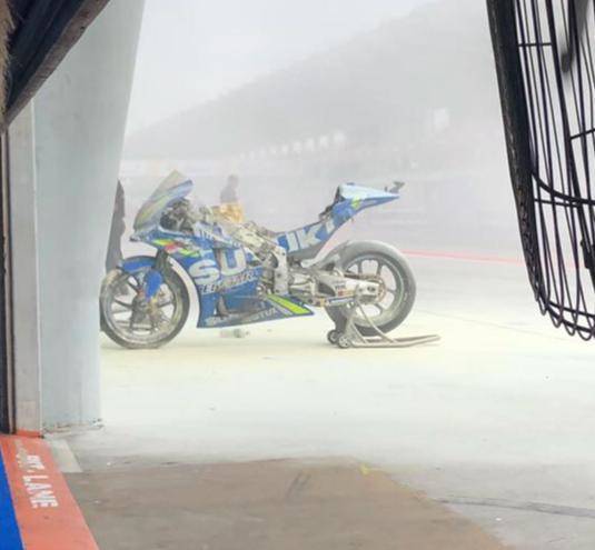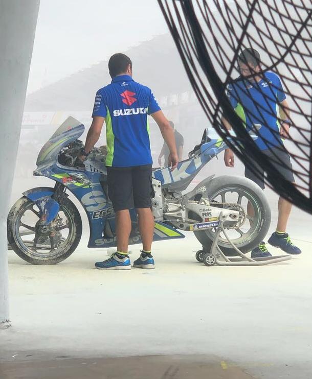 Один из прототипов Suzuki GSX-RR, на котором должен выступать Алекс Ринс, загорелся на пит-лейне в преддверии ГП Малайзии 2018. Мотоцикл загорелся в четверг после обеда, когда механик прогревал его.