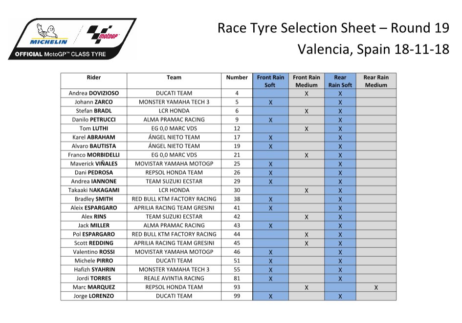 Марк Маркес (Repsol Honda) был автором самой оригинальной комбинации: из 23 гонщиков только у него сзади стояла средняя. Этот выбор подходил для трека умеренной влажности, но не для ливня. Из-за пониженного зацепа Маркес потерпел аварию. Он заметил, что пошел на риск, так как уже стал чемпионом MotoGP. В другой ситуации испанец сделал бы более безопасный выбор. Валентино Росси бился за первое место в первой стадии и за второе во второй. Два его «софта» были слишком изношены. Росси допустил падение, закончил 13-м.
