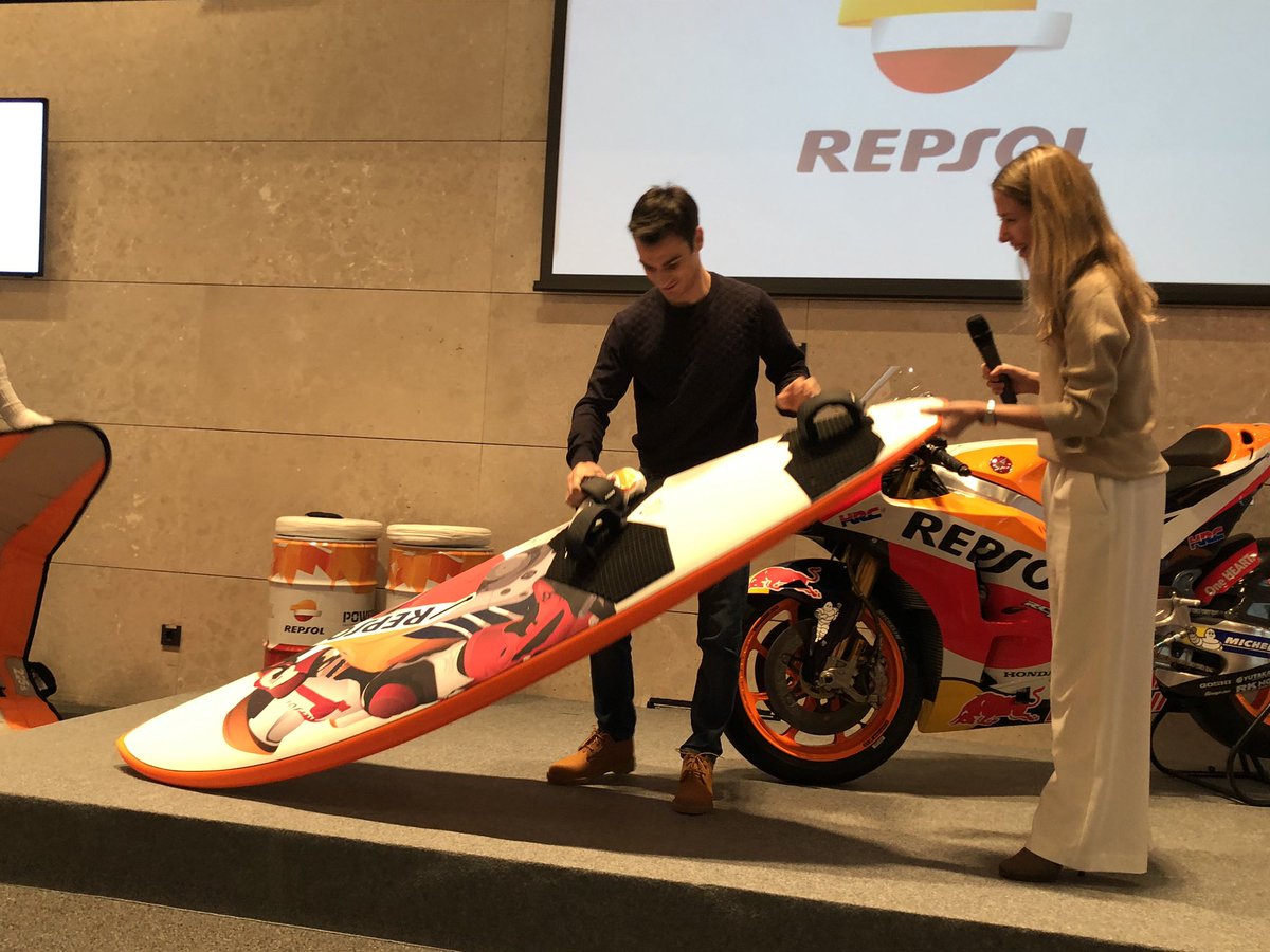Кое-что Педроса получил и для хобби. В понедельник он посетил Repsol Campus — мадридскую штаб-квартиру компании, спонсирующую заводскую команду Honda MotoGP с 1995 года. Ему подарили специально раскрашенную доску для сёрфинга. Заезды по волнам — одно из главных увлечений Педросы.