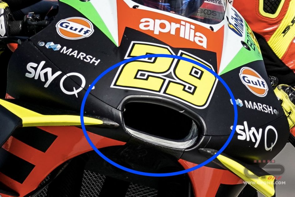 На изображении несложно заметить странное белое покрытие внутри воздушного отверстия Aprilia RS-GP. Это покрытие — простой и в то же время эффективный способ очистки воздушного потока от большого количества пыли и мусора. Производитель из Ноале подготовился к тому, что в Остине может быть очень грязно.