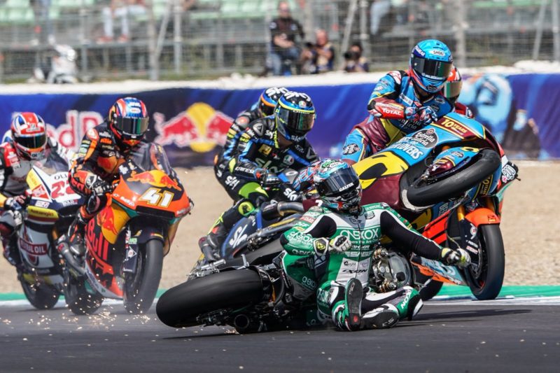 #фотоGP: завал в гонке Moto2 ГП Испании 2019 Первый старт гонки Moto2 ГП Испании 2019 не задался. После первого поворота случился массовый завал, а началось все с падения Реми Гарднера. Гонку прервали красными флагами. К счастью, с Реми все в порядке. Теги: Moto2, фотоGP Дата: 05.05.19 Источник: По материалам официального пресс-релиза Редактор: Все о мире MotoGP