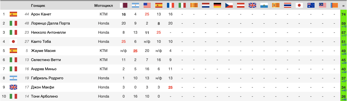 | поз. | очки | гонщик | нац. | команда | байк | время | км/ч | отст. | |