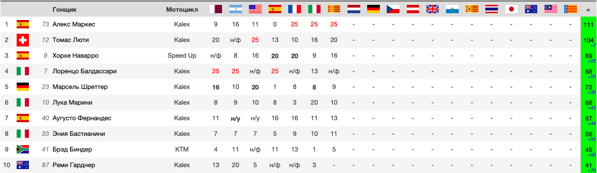 | поз. | очки | гонщик | нац. | команда | байк | время | км/ч | отст. | |