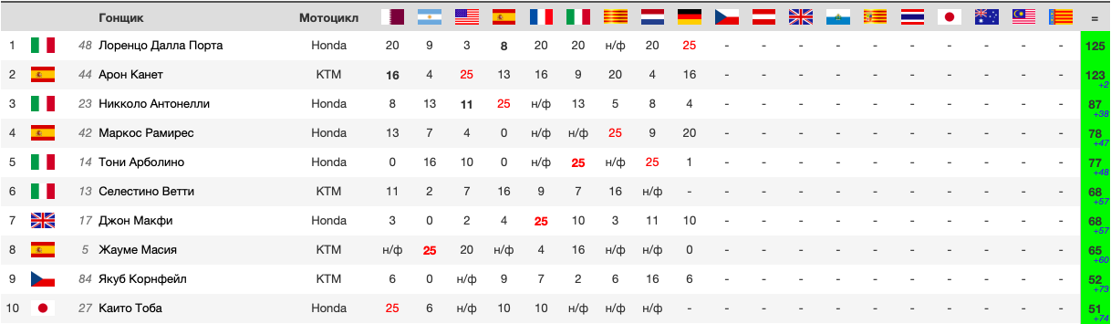 | - | 7 | Dennis FOGGIA | ITA | SKY Racing Team VR46 | KTM | 38'02.963 | 150.5 | +1 кр. | |