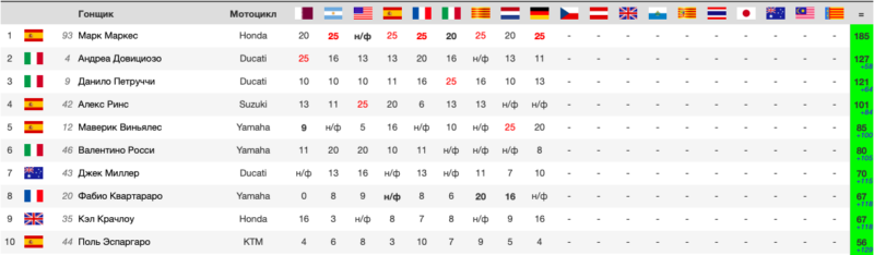 | поз. | очки | гонщик | нац. | команда | байк | время | км/ч | отст. | |