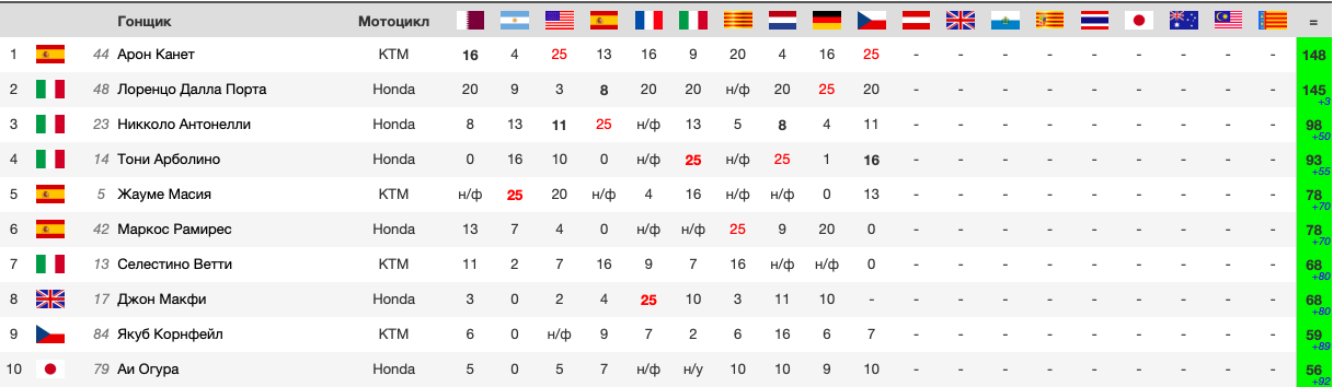 Положение в чемпионате после гонки Moto3 Гран-При Чехии 2019: