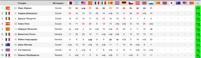 Результаты гонки MotoGP Гран-При Сан-Марино 2019