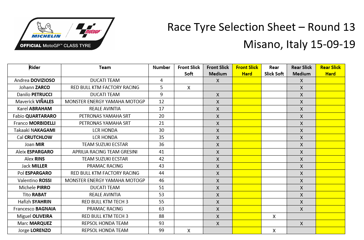 Гонщики, их бригады и техники-советники Michelin весь уик-энд ломали голову над равновесием между динамикой, сцеплением и износом. Почти весь пелотон из 22 ездоков пришел к одинаковому выводу — комбинации из обеих средних шин. На решетке нашлось всего 3 оригинала с собственными комбинациями — Жоанн Зарко, Мигель Оливейра и Хорхе Лоренсо.