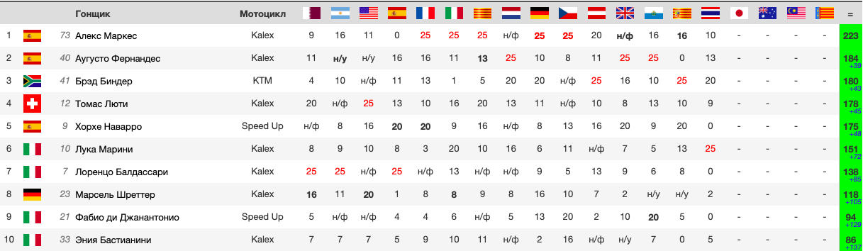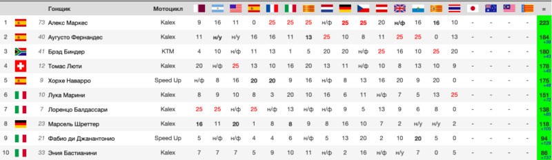 | поз. | очки | гонщик | нац. | команда | байк | время | км/ч | отст. | |