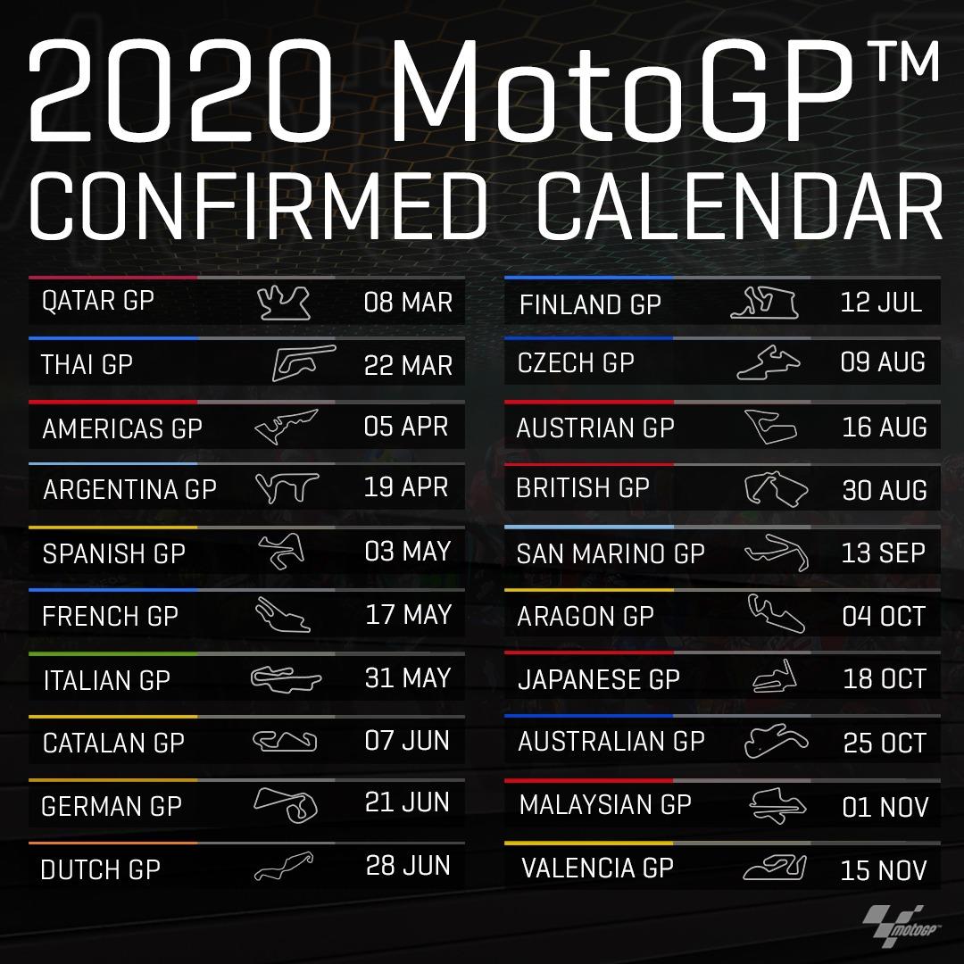 «Новое» расписание грядущего чемпионата MotoGP ничем не отличается от предварительной версии, опубликованной в августе 2019-го. Сезон начнётся 8 марта в Катаре, закончится 15 ноября в Испании (Валенсии), и посетит рекордные 20 этапов. Все этапы 2019-го сохранятся, и получат свежайшее дополение — впервые с 1982 года гранприйный цирк посетит Финляндию.