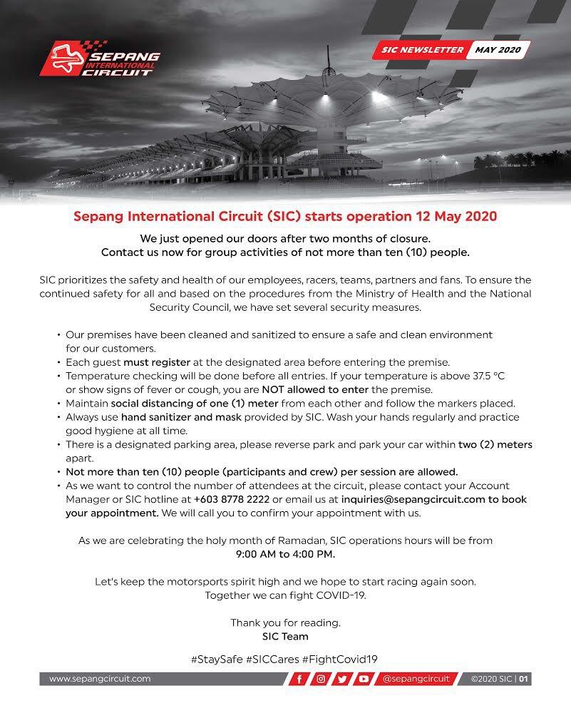 На другом конце Земли идут те же процессы, страны переходят к более щадящей карантинной фазе №2. 12 мая объявил об открытии и Sepang International Circuit в Малайзии. Согласно правилам их Минздрава и МЧС, на входе у зарегистрированных гостей измеряют температуру тела, и если она выше 37,5 градусов, дальше не пустят. Обязательно соблюдение метровой дистанции между людьми, постоянное мытьё рук, на одну трековую сессию допускается не больше 10 человек (участники и механики).
